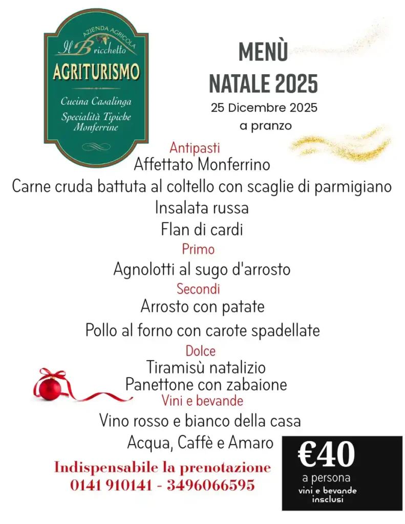 Siamo lieti di annunciarvi che il nostro menù di Natale 2025 è finalmente pronto e vi aspetta per festeggiare insieme all’Agriturismo Il Bricchetto di Penango!